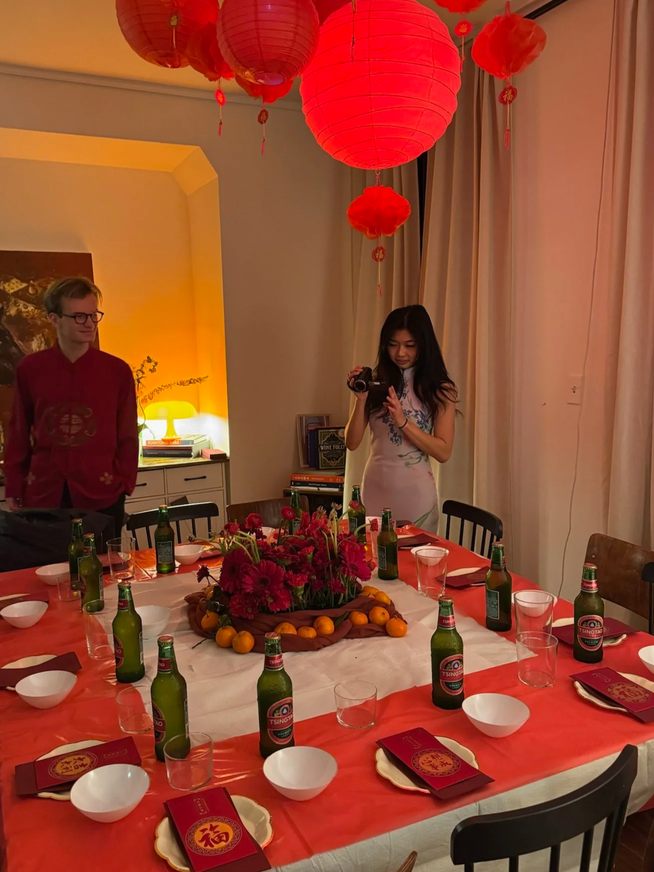 A living room transformed through layered lantern installation at varying heights and a red floral centerpiece anchored by mandarins, a traditional symbol of gold, wealth, and good fortune.