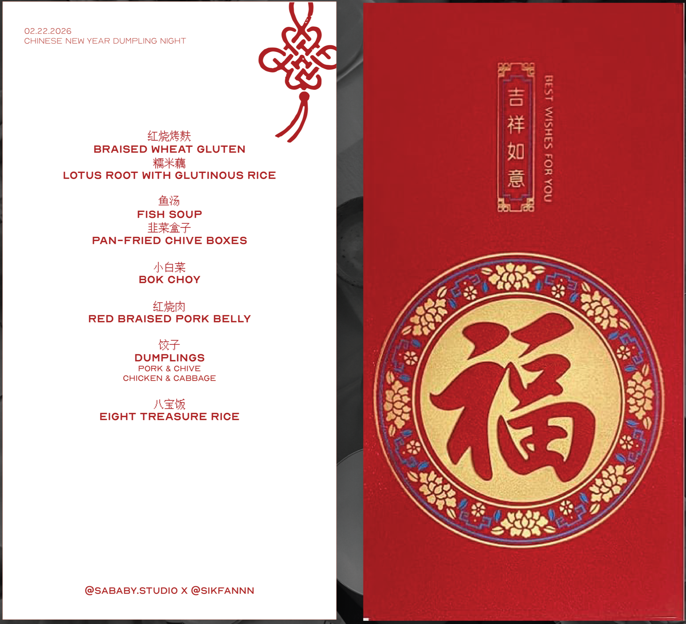 THE MENUPresented in traditional red envelopes, the Lunar New Year tradition of gifting luck and prosperity.