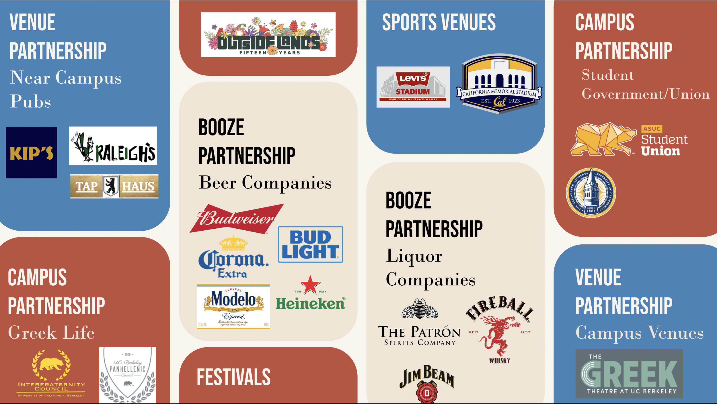 After evaluating their suitability for collaboration and brand image for Pour Decisions, we have proposed three categories of partnerships: Booze Companies, Campus Organizations, and Venues.